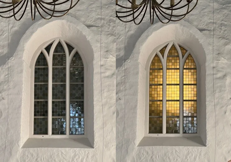 Sysmän kirkko on jo itsessään upea paikka työskennellä, mutta remontissa tilaan lisättiin vielä enemmän näyttävyyttä. Alttarin yläpuolella olevassa ikkunassa on kaunis lasimaalaus, joka oli jäänyt 1830-luvulla sakastin rakentamisen jälkeen pimentoon. Remontissa sakastin ullakolle ikkunan taakse vietiin säädettävää lisävalaistusta, joka heijastuu ullakolle asetetuista levyistä ja saa maalauksen jälleen hehkumaan koko loistossaan.