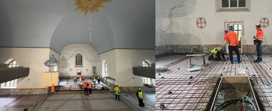 Vanhasta tiililattiasta löytyi asbestia, joten LKN Rakennus huolehti ensin asbestipurusta, ja sitten Ansioniemen Sähkö pääsi vauhtiin lattialämmityksen uusimisen ja sähköremontin kanssa. Heiltä tuli myös hyviä kehitysehdotuksia remontin aikana. Esimerkiksi kirkon keskikäytävälle tehtiin nyt kouru, johon kaikki tekniikka upotettiin. Se helpottaa tulevia ylläpitotöitä, kun tekniikkaa on helpompi hallita.